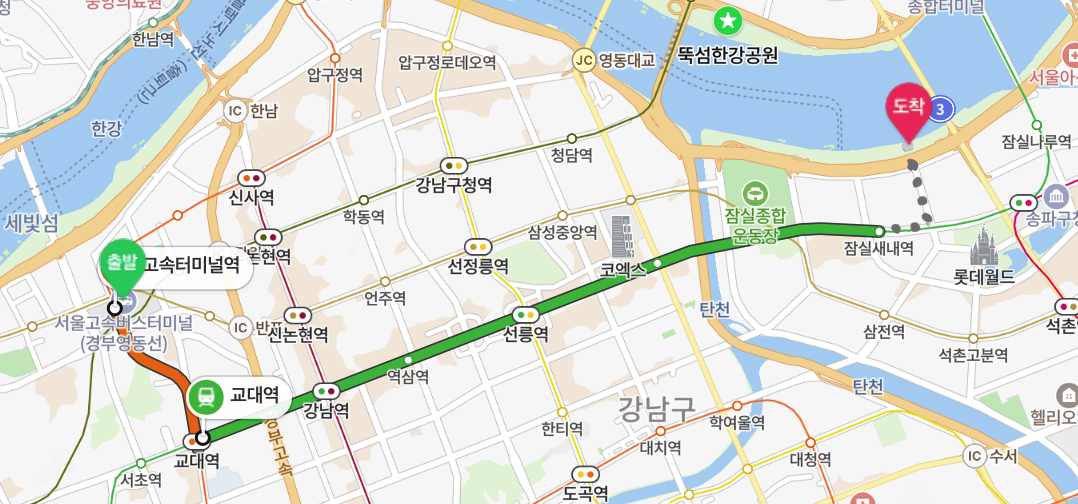 버스를 타면 고속버스 터미널에 내립니다. 3호선과 2호선을 환승하면 잠실 한강공원에 도달할 수 있습니다. 기차보다는 낫네요.