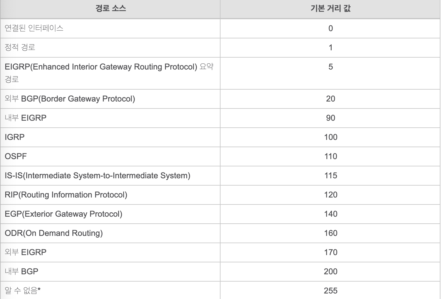 이를 AD(Administrative Distance) 라 부르며, 이는 라우터 장비를 생산하는 회사에 따라 다릅니다.
