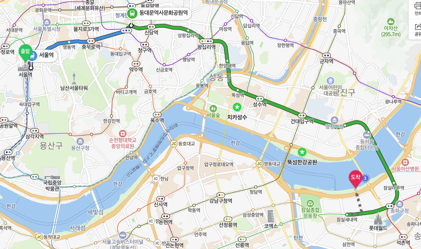 기차를 타면 서울역에 내립니다. 4호선과 2호선을 환승해 잠실 한강공원에 도달할 수 있습니다. 정거장을 11개나 거쳐야 하네요.