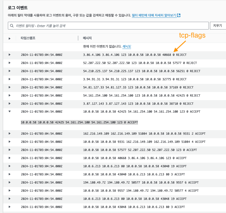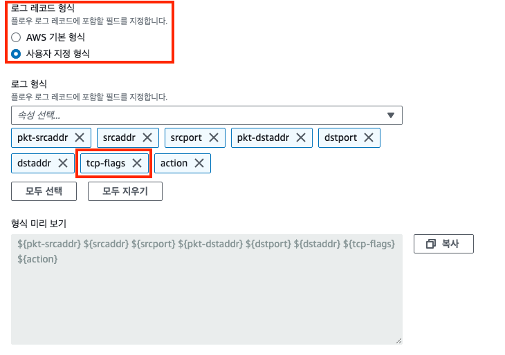 사용자 지정 형식에 tcp-flags를 추가해 패킷 모니터링 결과를 CloudWatch Logs로 전송해 보겠습니다.