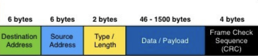 출발지와 목적지 MAC 주소, 상위 계층의 프로토콜을 지시하는 Ether Type, 실제 데이터 페이로드, 오류 검출을 위한 CRC 까지 모두 64바이트입니다. 이더넷 프레임이 왜 최소 64 Byte로 설계되었는지는 과거 반이중 통신 방식을 사용할 때 충돌 회피(CSMA/CD)와 당시 ㅛ표준 규격이었던 10Base5 케이블의 한계 때문인데, 본 글의 주제와는 다른 내용이므로 다른 글에서 다뤄보겠습니다.