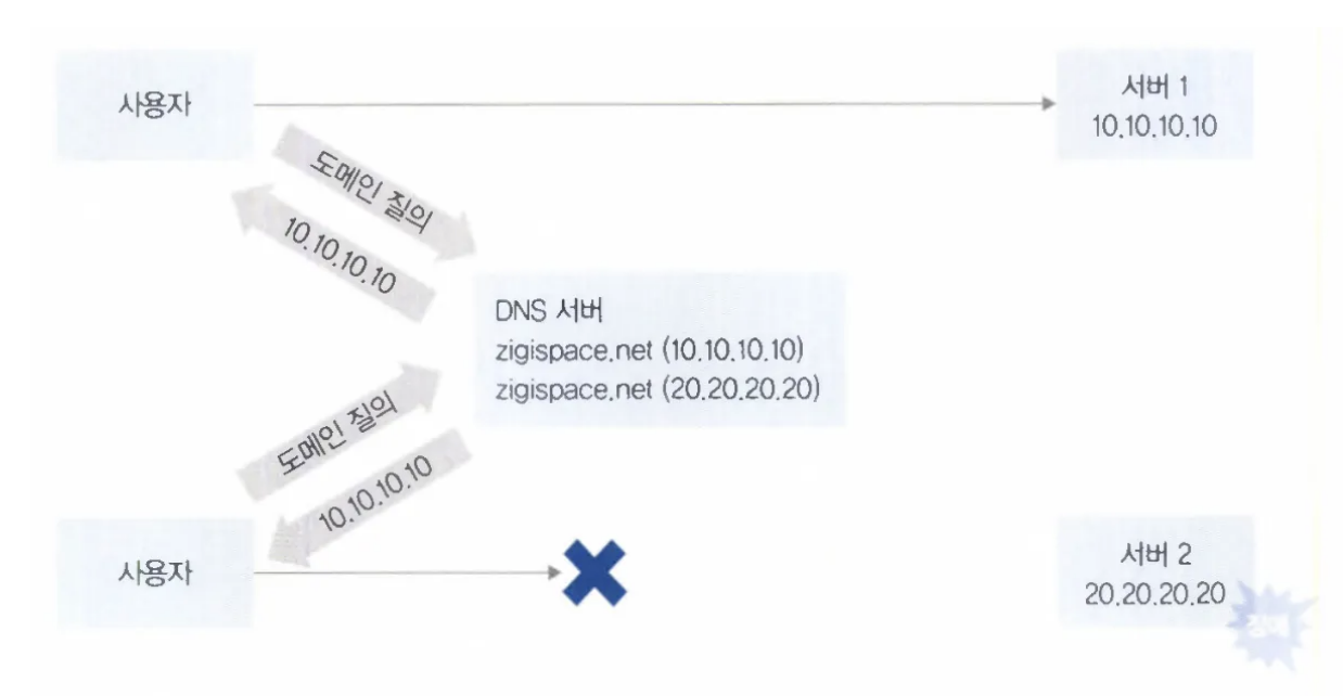 DNS는 단점이 있습니다. 도메인 질의에 의해 IP 주소를 반환할 때 헬스체크를 하지 않는다는 점입니다. 헬스체크를 하지 않고 단순히 번갈아가며 IP를 반환하는 Round Robin 방식으로 동작하기 때문에, 최악의 경우에는 서비스 불가능한 IP 주소만을 계속 응답할 수 있습니다.