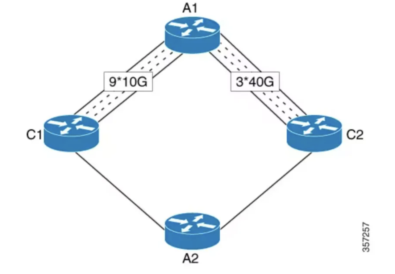 그래서 UCMP 가 등장했습니다. Un-equal Cost Multi-Path의 약자로, 비용이 다른 경로에 부하를 분산하는 기능입니다. 위의 그림으로 예를 들면 A1에서 C1으로 가는 경로는 90 Gbps의 대역폭을 가지는 반면 C2로 가는 경로는 120 GBps의 경로를 가지므로 C2로 더 많은 트래픽을 보내는 방식입니다.