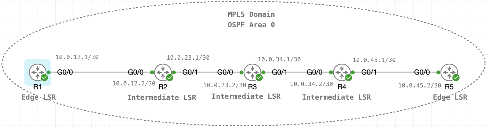 먼저, MPLS에 참여하는 라우터를 Label Switching Router, LSR이라고 합니다. 또한 같은 MPLS 도메인 중, MPLS 도메인의 경계에 있는 라우터(위 그림에서는 R1과 R5)를 Edge LSR이라고 합니다. R1과 R5사이에서는 MPLS로 통신하다가, 그 이후에는 원래대로 IP 라우팅으로 통신하는 방식이지요.
