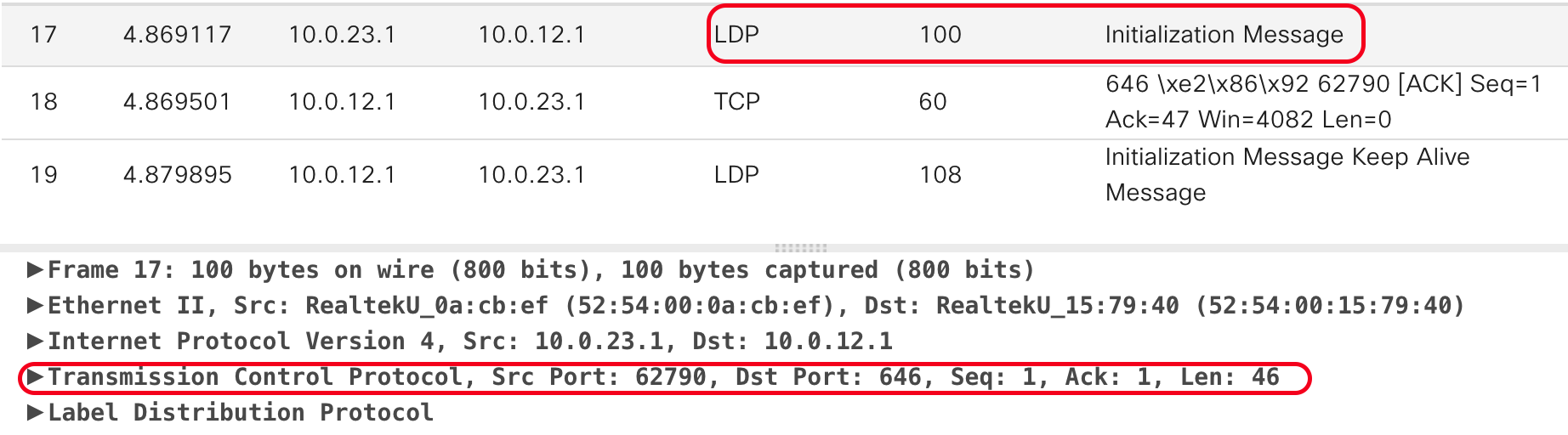 먼저 전송 계층으로 UDP를 사용해 멀티캐스트 주소(224.0.0.2)로 LDP Hello 메시지를 송신하고, LDP 이웃을 발견합니다.