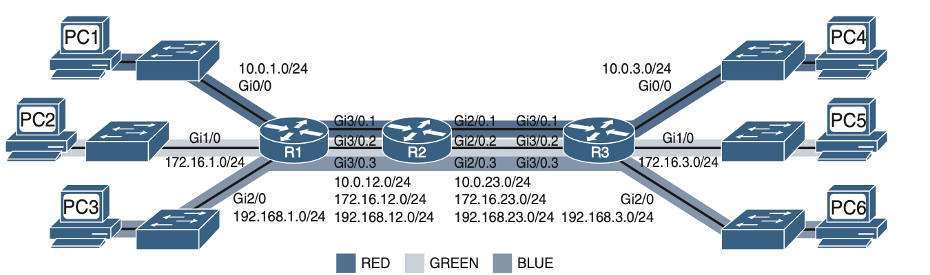 VRF도 마찬가지입니다. 라우팅의 분리, 한개의 라우터를 여러개의 라우터처럼 사용하기 위해 라우팅 테이블을 분리하는 기술이 VRF 입니다. Cisco Press 교재의 예시로 토폴로지를 만들어 보았습니다.