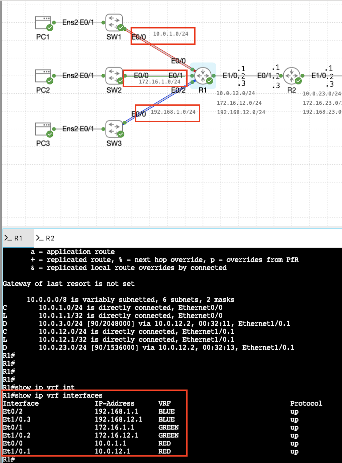 show ip vrf int 명령어로 각 인터페이스에 어떤 VRF가 적용되었는지 확인할 수 있습니다. 위의 그림에서는 RED 라우팅테이블은 10 대역, GREEN은 172 대역, BLUE는 192 대역으로 VRF 인터페이스를 보유하고 있습니다.