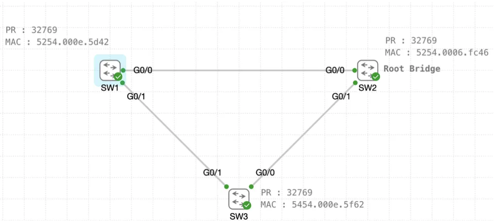 Cisco CML을 사용한 STP 가상환경 시뮬레이션 랩입니다. STP에서 비교하는 우선순위 값은 32768이 기본입니다. 거기에 디폴트 VLAN의 값인 1을 더해 Bridge Priority값은 세 스위치 모두 32769가 되었습니다.