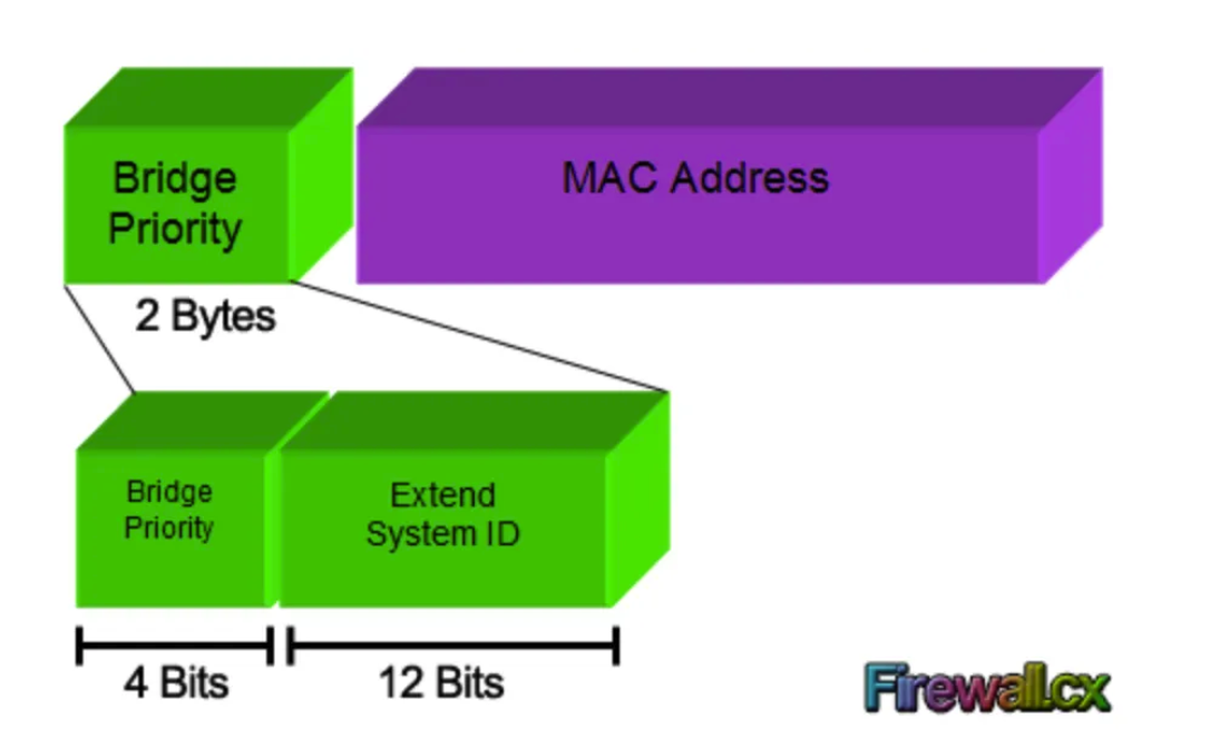 위 구조는 Bridge ID(BID)입니다. BID를 비교해 값이 작은 스위치가 해당 스패닝트리에서 루트 브리지가 됩니다. 해당 스위치의 우선순위(Bridge Priority) 값과 VLAN ID를 첫 2바이트에 담고, 스위치의 MAC주소를 6바이트 공간에 담습니다. 이 BID를 비교해 루트 스위치를 선출하게 됩니다.
