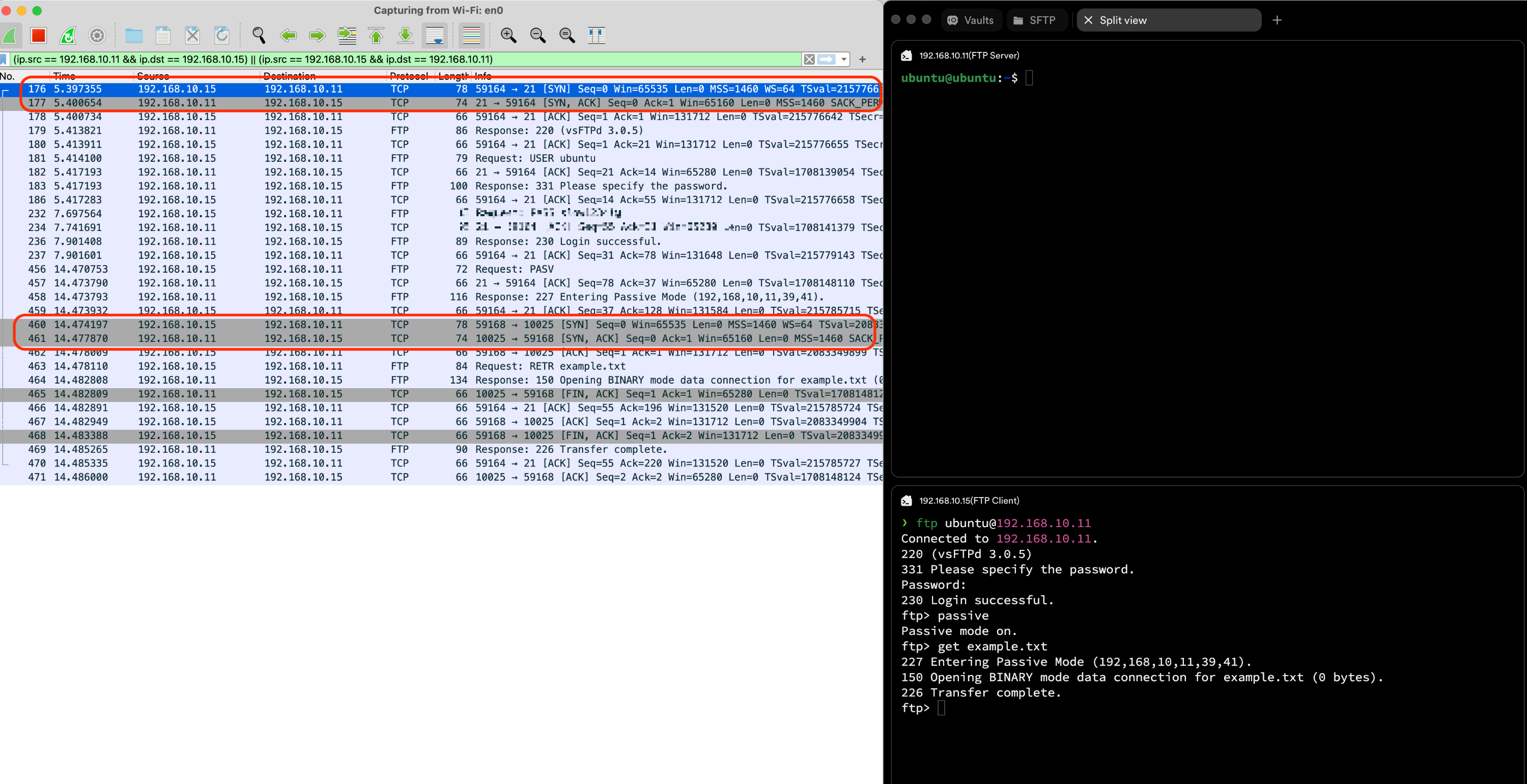 FTP Passive 모드에서는 176 번째 패킷과 460번째 패킷에서 컨트롤 커넥션과 데이터 커넥션의 출발지가 모두 192.168.10.15(FTP Client) 에서 시작되는것을 확인할 수 있습니다.