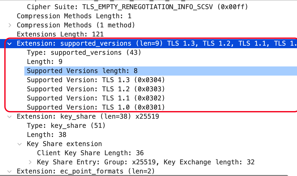 이 패킷은 TLS 1.0부터 1.3 버전까지 지원하고, 암호화 알고리즘은 SHA, RSA 등 여러 알고리즘을 지원하네요.