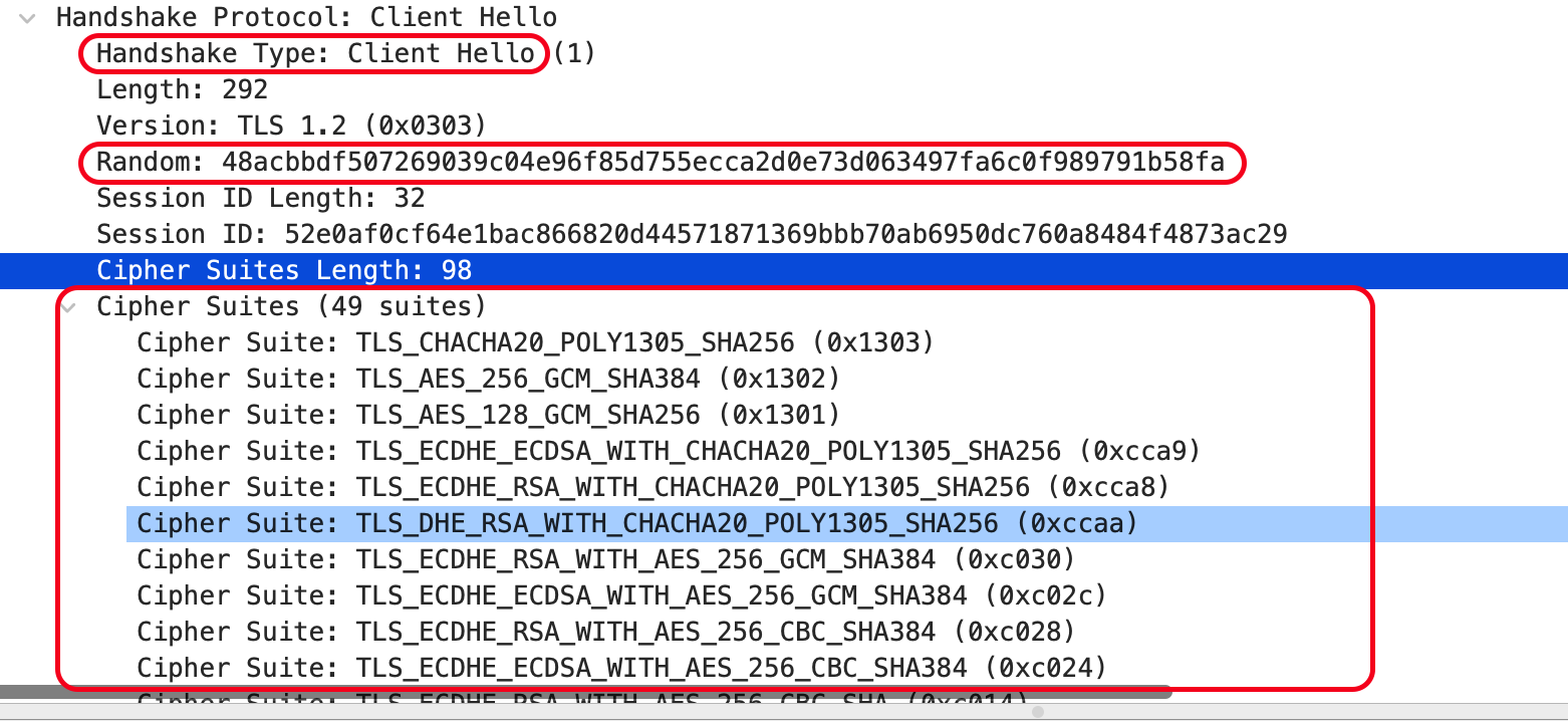 Server Hello 패킷에서 암호화에 필요한 랜덤 값과 선택한 암호화 알고리즘을 확인할 수 있습니다.